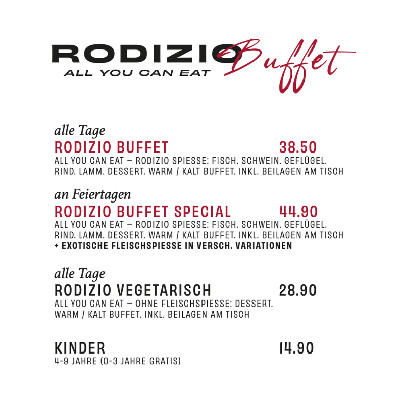 Genießen Sie unser vielfältiges All-You-Can-Eat-Angebot, das von saftigem Fleisch und frischem Fisch bis hin zu köstlichen vegetarischen Optionen reicht. Unser kulinarisches Erlebnis ist perfekt für jeden Geschmack und jedes Alter.